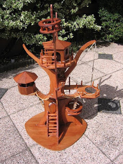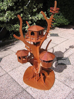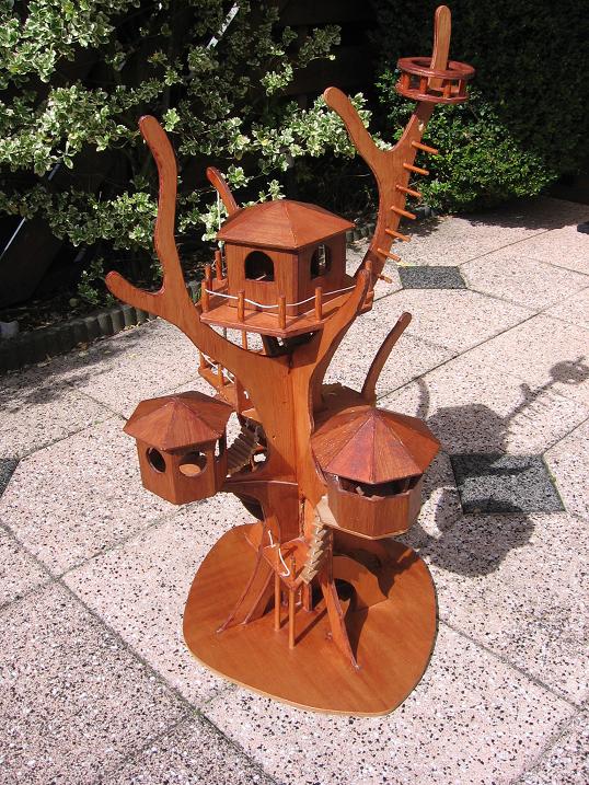 Het is alweer meer dan 2 jaar geleden dat mijn vader deze houten boomhut heeft gemaakt maar omdat er sindsdien nogal veel gebeurd is ben ik er nog niet aan toegekomen om hem hier even te 'showen'. Mijn vader kreeg in augustus 2009 een beroerte en kampt sinds die tijd met Afasie. Daarbij heeft hij verlammingsverschijnselen gehad en kan hij nu wel weer alles goed gebruiken maar kleine details maken gaat niet zo goed meer.