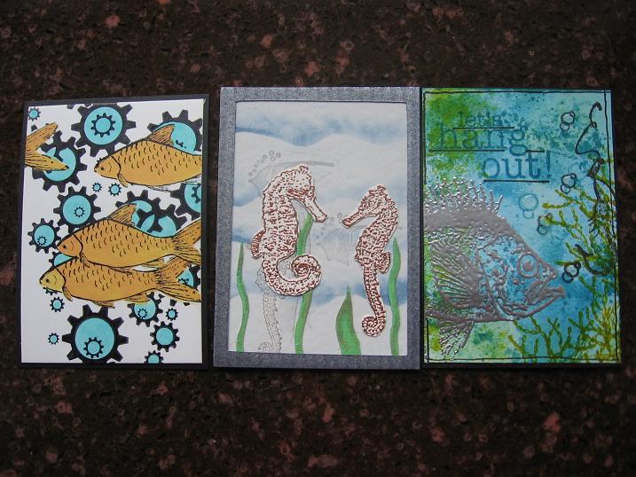 Ik heb meegedaan aan een ATC swap op het Scrappersanonimousforum. Het thema deze keer was "Onder water". Het was heerlijk om lekker te kunnen kliederen met gesso, verf en de Transparante Gloss gel.